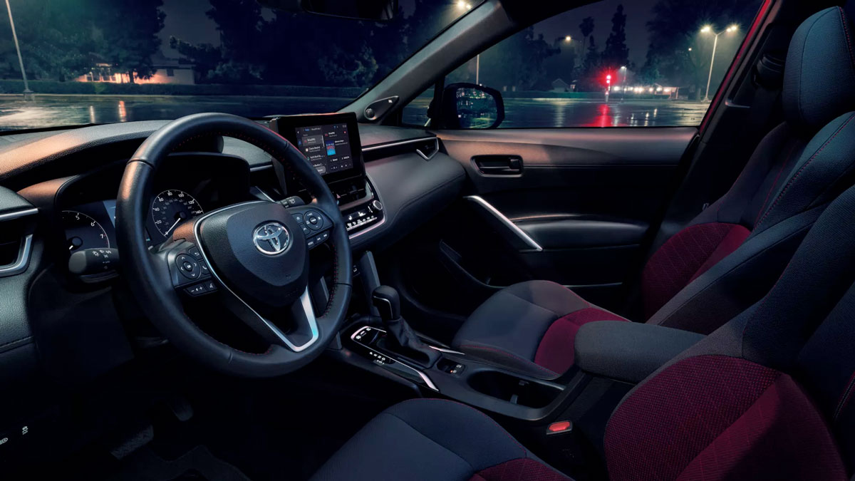 کابین کرولا کراس ۲۰۲۴ با طراحی مدرن و مینیمال، فضای باز و راحتی برای ۵ سرنشین فراهم میکند. داشبورد ساده با تزئینات مشکی براق و صندلیهای نرم با گزینه SofTex، تجربهای باکیفیت ایجاد میکند. امکانات دیجیتال شامل نمایشگر لمسی ۸ اینچی، نمایشگر راننده دیجیتال و اتصال Apple CarPlay/Android Auto، همراه با تهویه دو منطقهای و پورتهای USB‑C، راحتی و کاربردپذیری بالا را تضمین میکنند.